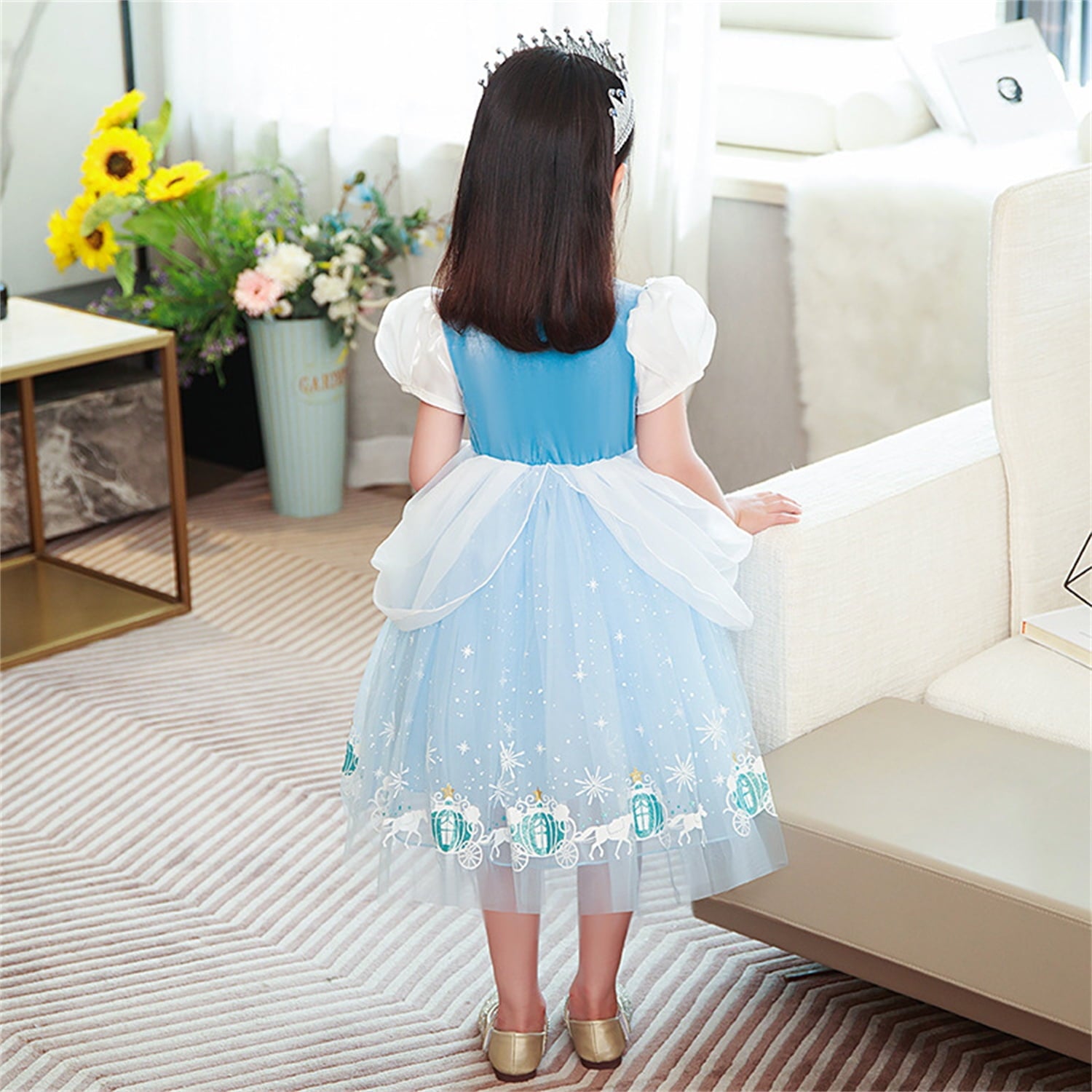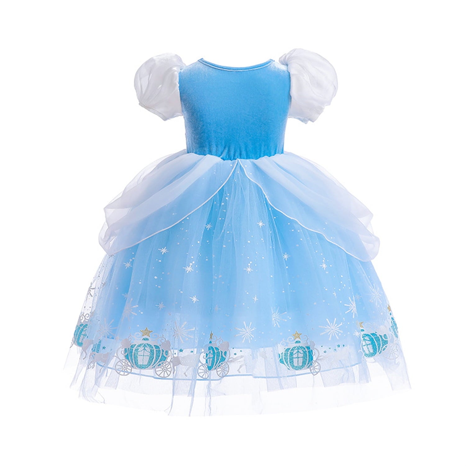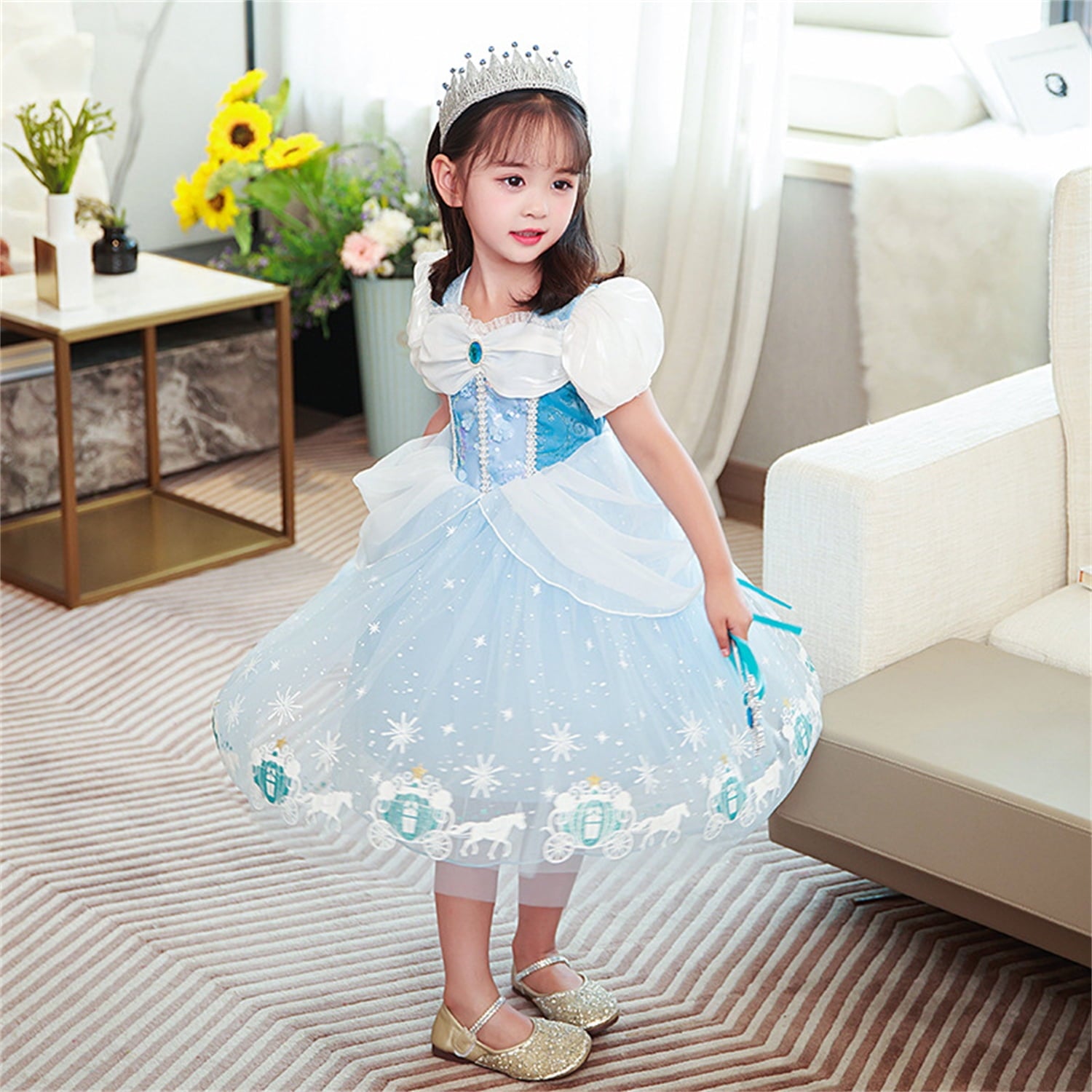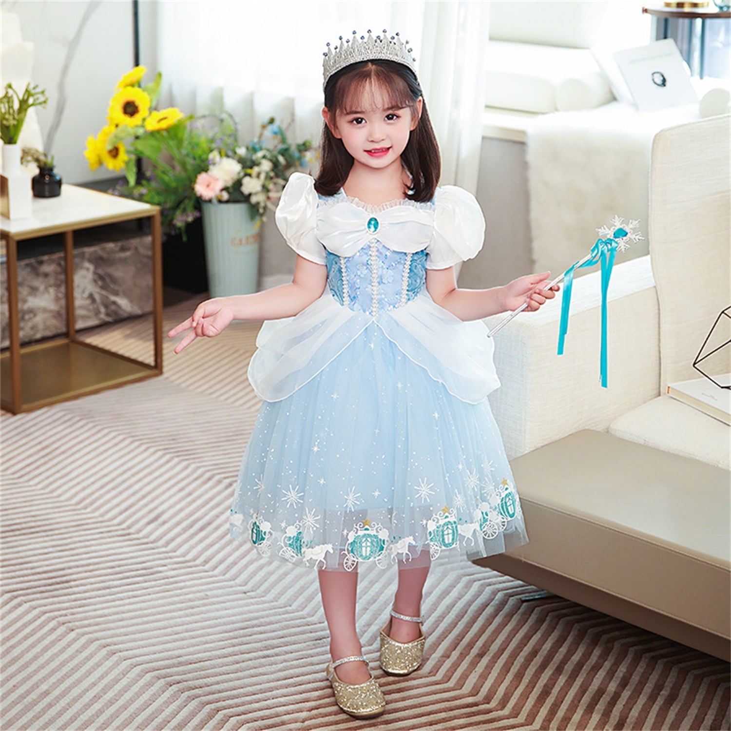Dress features: beautiful blue Cinderella dress, bubble sleeves for girls, shiny diamonds in the chest, elastic upper body, shiny tulle decoration and lace, very elegant and fluffy skirt. Once you wear this Cinderella Princess dress, your princess will become the focus of the crowd!