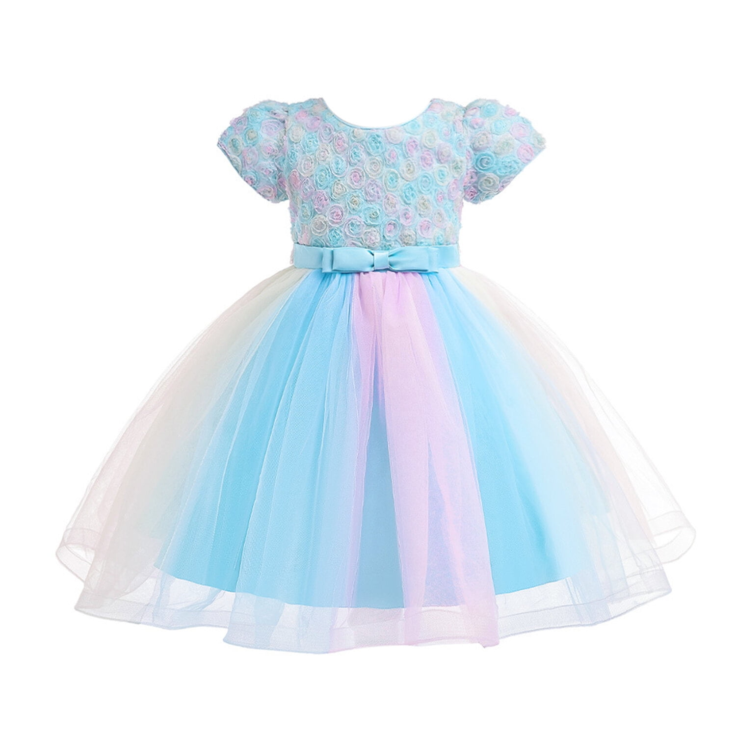- Girls tutu skirts, rainbow color, round neck, tulle, waist bowknot, 3D flowers decoration, piano performance dresses for little girls.