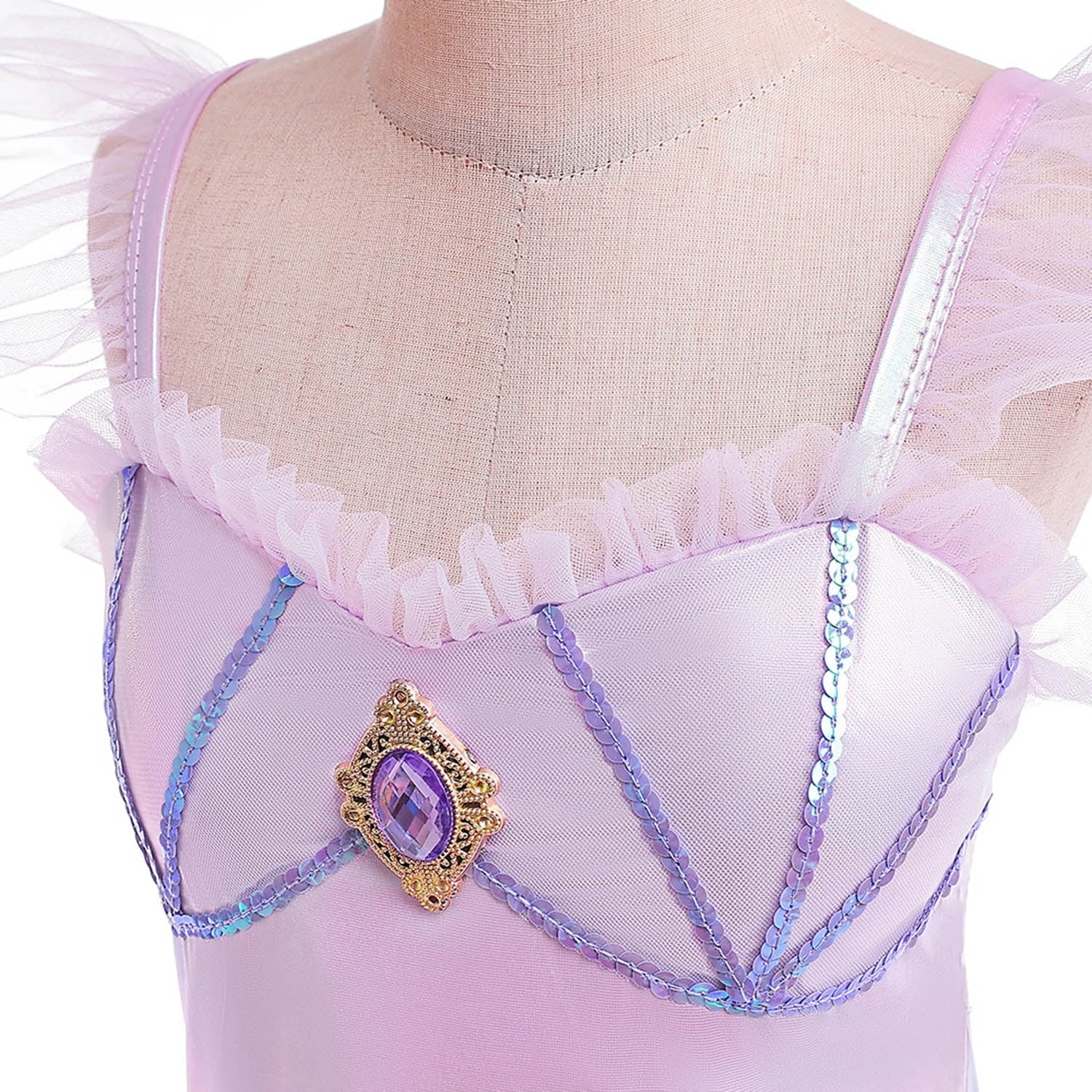 - The gorgeous mermaid costume for girls features shiny purple sequins and gemstone, with silk ruffles at the waist and skirt hem