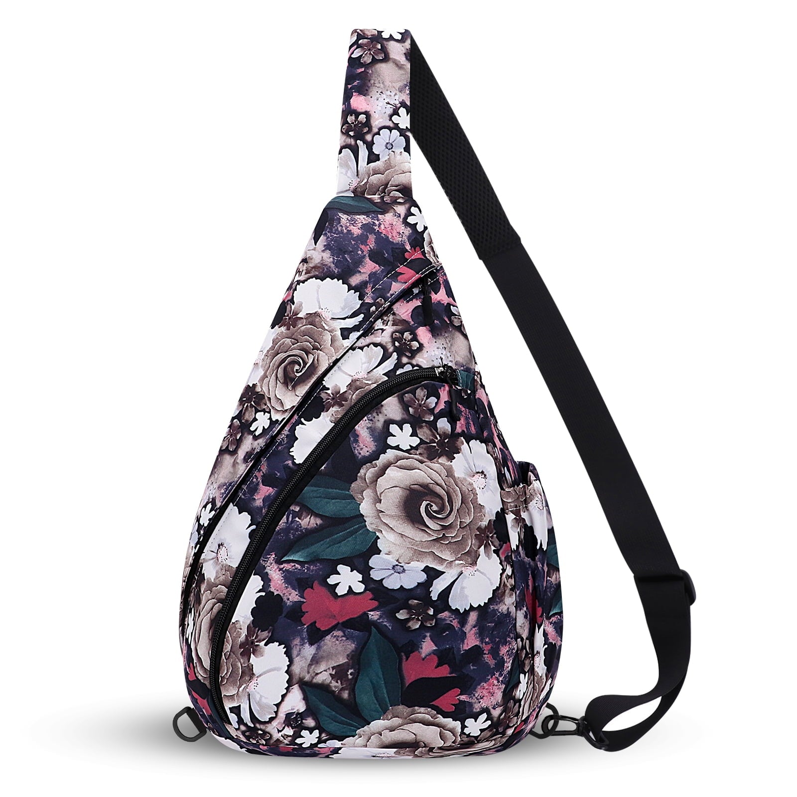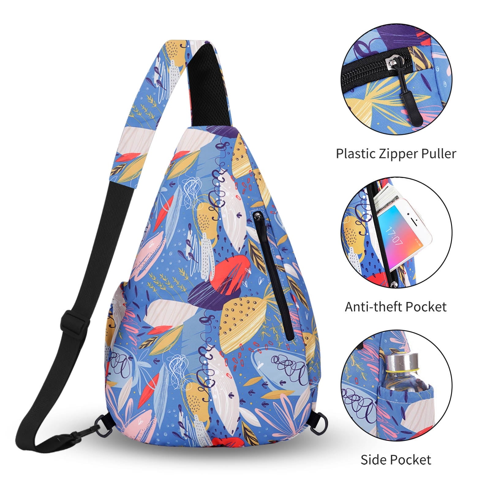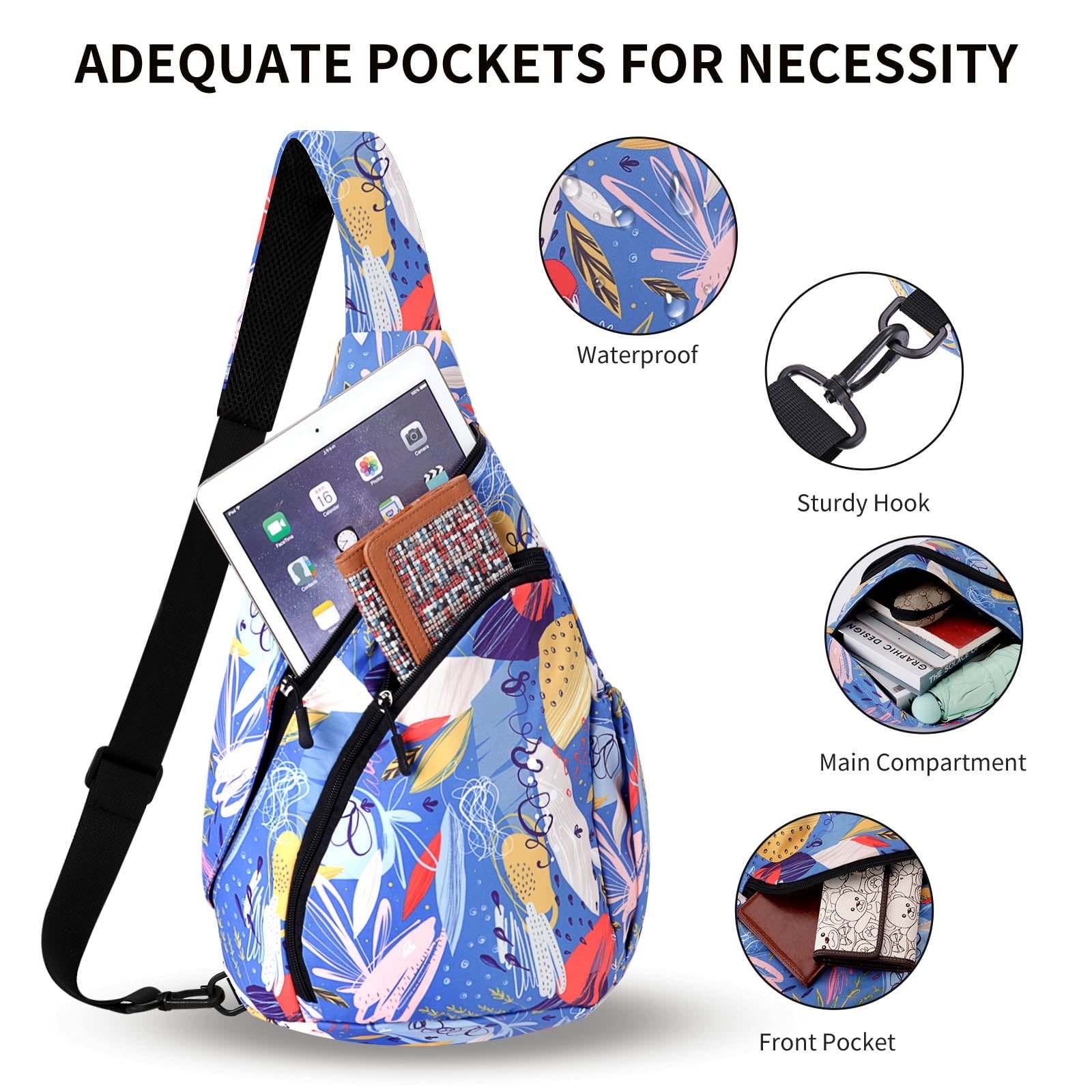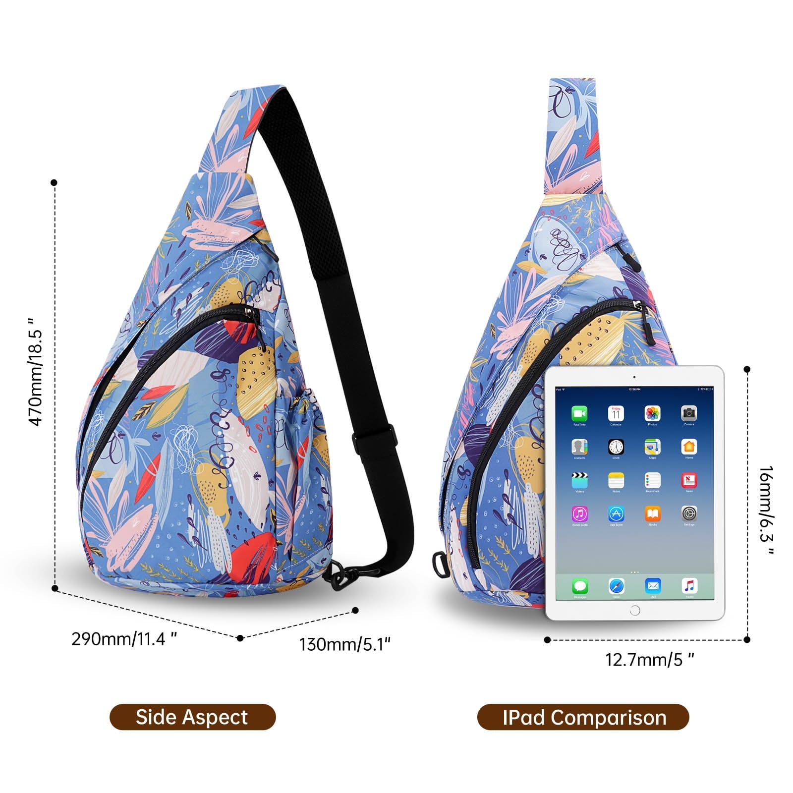 - Large-Capacity Sling Bag: Includes 4 pockets for a 12-inch notebook, clothes, camera, cosmetics, data cables, chargers, keychains, wallet, cell phone, and water bottle