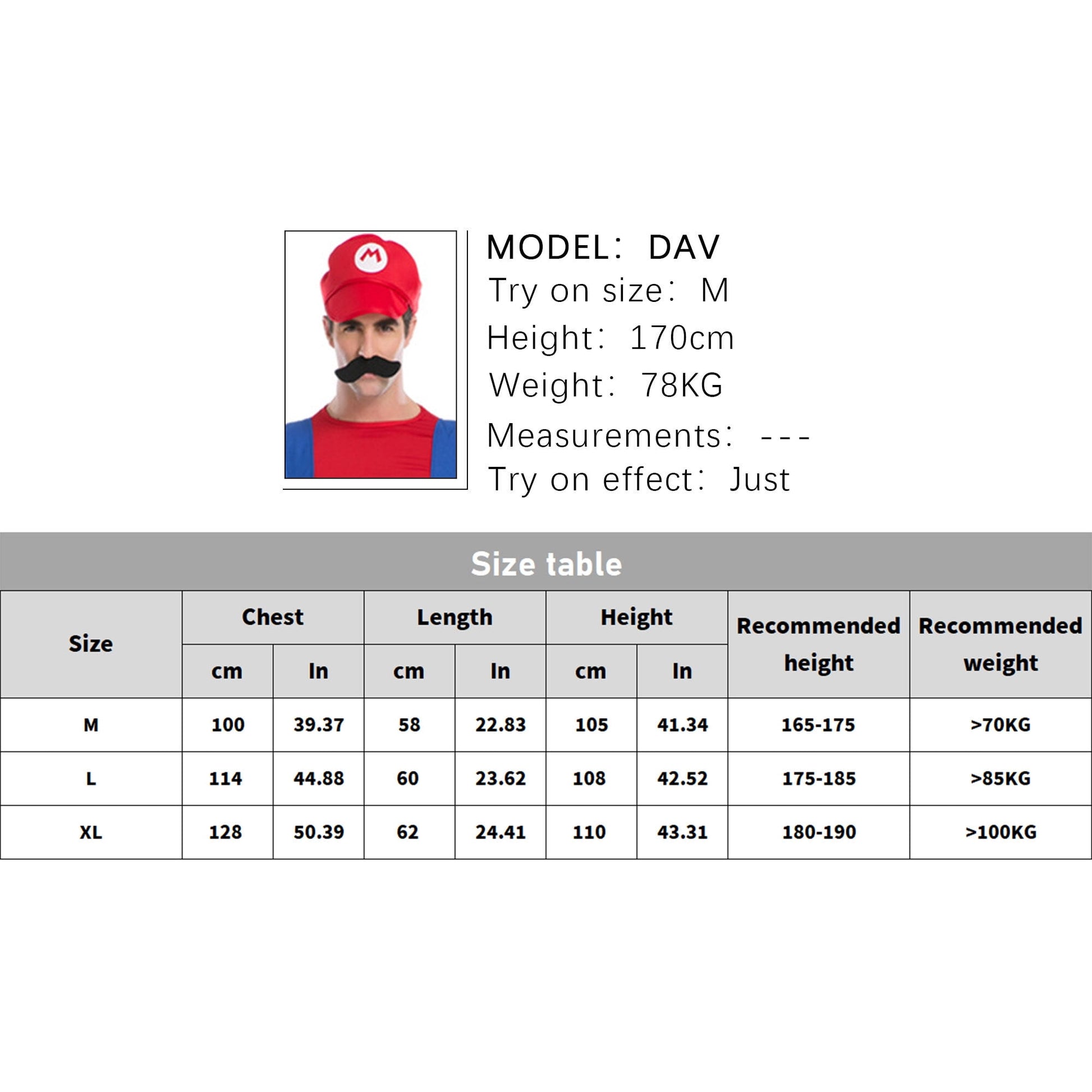 The costume set includes: Hat,gloves,tops, Jumpsuit overalls with big yellow buttons, faux character Mustache.