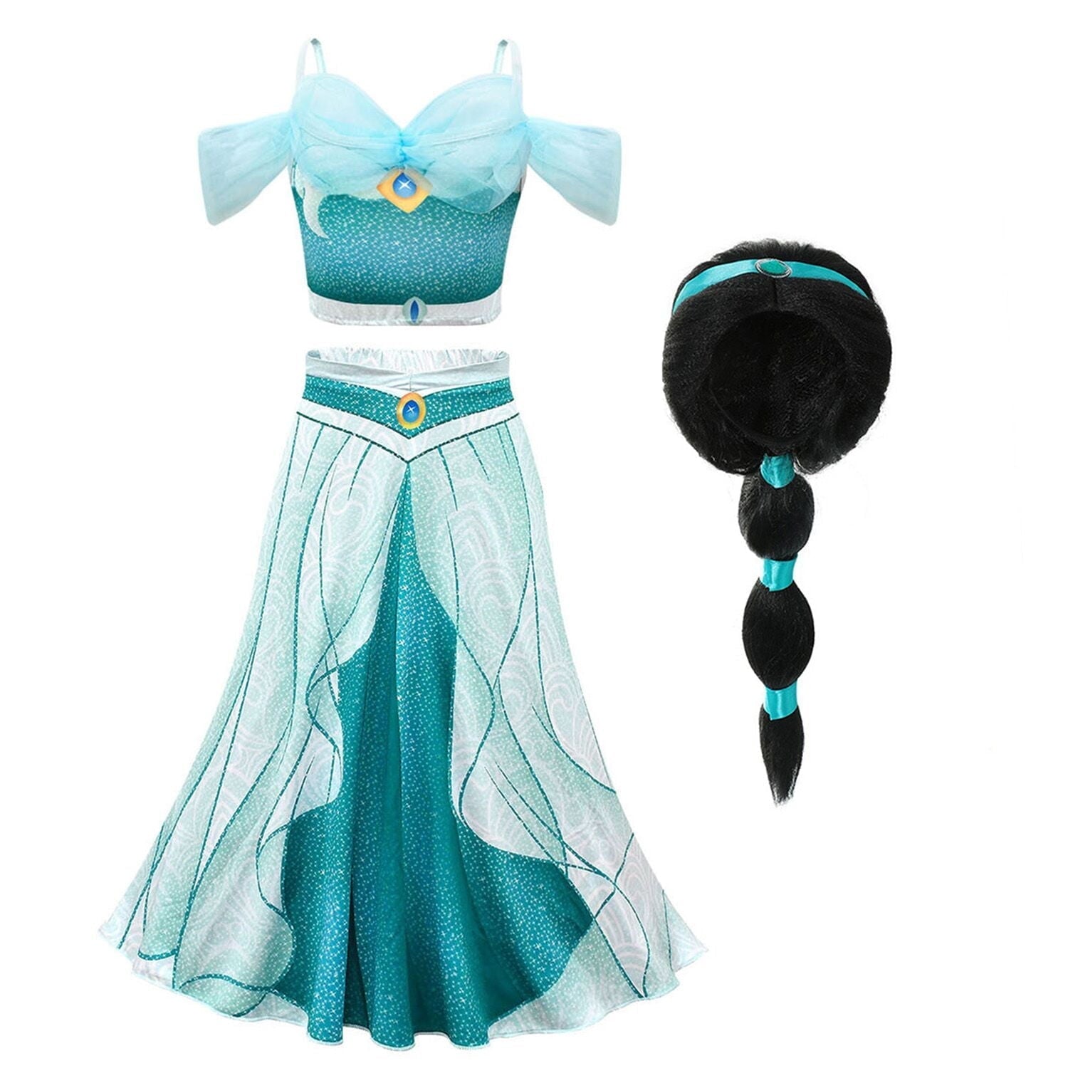 This Two-Piece outfit set includes a beautiful off shoulder belly dance crop top, a skirt with elastic band and a Jasmine wig for kids. Girls green classic princess dress up costume outfit. Put you in the world of role play.